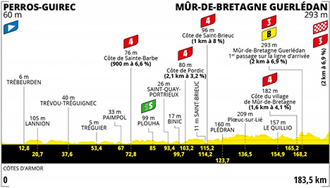 ![]() dimanche 27 juin 2021 ![]() 11h20 (Côtes d'Armor) : D788 Perros-Guirec/Bd. de la Corniche (km 0) - Ploumanac'h (km 1.5) - Trégastel (km 2.7) - Trébeurden (km 12.8) - D65 Lannion (km 20.7) - D38 Trélévern (km 36.1) - Trévou-Tréguignec (km 37.6) - Port-Blanc (km 42.7) - D74 Penvénan (km 45.3) - D70 Plouguiel (km 50.7) - D8 Tréguier (km 53.4) - D786 Lézardrieux (km 62.2) - Paimpol (km 67) - Côte de Ste-Barbe (km 72.8-GPM4) - D786 Plouézec (km 74.4) - Lanloup (km 80) - Plouha (km 85-sprint) - Tréveneuc (près de) (km 89.7) - Saint-Quay-Portrieux (km 93.4) - Binic (km 99.7) - Côte de Pordic (km 103.2)-GPM4) - D786 Plérin (km 112.3) - Saint-Brieuc (km 114.2) - Côte de Saint-Brieuc (km 115.2-GPM4) - D27 Trégueux (km 119.3) - Plédran (km 123.7) - Saint-Carreuc (km 129.8) - Ploeuc-sur-Lié (km 136.5) - Saint-Hervé (km 147.9) - D76 Uzel (près de) (km 148.9) - D35 Le Quillio (km 154.9) - Saint-Guen (km 160) - Mûr-de-Bretagne (km 164) - D767 Côte du village de Mûr-de-Bretagne (km 165.2-GPM4 ) - Mûr de Bretagne (km 168.2-bonus-GPM3) - D76 Saint-Mayeux (km 171.6) - D69 Saint-Gilles-Vieux-Marché (km 174.8) - D767 Mûr-de-Bretagne Guerlédan (km 183.5-GPM3). ![]() ![]() ![]() Vidéo Tour de France/DailyMotion ![]() Étape : ![]() 1. Mathieu Van der Poel (Hol) en 4h18'30" (moy : 42.59 km/h) 2. Tadej Pogacar (Slo) à 6" 3. Primoz Roglic (Slo) 4. Wilco Kelderman (Hol) 5. Julian Alaphilippe (Fra) à 8" 6. Bauke Mollema (Hol) 7. Jonas Vingegaard (Dan) 8. Sergio Higuita (Col) 9. Pierre Latour (Fra) 10. Jack Haig (Aus) 11. Michael Woods (Can) 12. Richard Carapaz (Equ) 13. Enric Mas (Esp) 14. David Gaudu (Fra) 15. Nairo Quintana (Col) 16. Alexey Lutsenko (Kaz) 17. Alejandro Valverde (Esp) 18. Pello Bilbao (Esp) 19. Steven Kruijswijk (Hol) 20. Dylan Teuns (Bel) 21. Esteban Chaves (Col) 22. Emanuel Buchmann (All) 23. Wout Van Aert (Bel) 24. Guillaume Martin (Fra) 25. Rigoberto Uran (Col) 26. Sergio Henao (Col) 27. Sonny Colbrelli (Ita) 28. Geraint Thomas (Gbr) à 23" 29. Ion Izagirre (Esp) 30. Miguel Angel Lopez (Col) 31. Jakob Fuglsang (Dan) 32. Ruben Guerreiro (Por) 33. Vincenzo Nibali (Ita) 34. Aurélien Paret-Peintre (Fra) 35. Louis Meintjes (Afs) 36. Alex Aranburu (Esp) 37. Wout Poels (Hol) 38. Quentin Pacher (Fra) 39. Lucas Hamilton (Aus) à 28" 40. Daniel Martin (Irl) à 36" 41. Elie Gesbert (Fra) à 42" 42. Richie Porte (Aus) 43. Franck Bonnamour (Fra) à 49" 44. Søren Kragh Andersen (Dan) à 51" 45. Tiesj Benoot (Bel) 46. Kasper Asgreen (Dan) à 59" 47. Xandro Meurisse (Bel) 48. Kenny Elissonde (Fra) 49. Toms Skujins (Lat) 50. Jan Bakelants (Bel) 51. Greg Van Avermaet (Bel) 52. Ben O'Connor (Aus) à 1'06" 53. Stefan De Bod (Afs) à 1'11" 54. Warren Barguil (Fra) à 1'14" 55. Matej Mohoric (Slo) à 1'30" 56. Davide Formolo (Ita) à 1'35" 57. Simon Yates (Gbr) à 1'44" 58. Julien Simon (Fra) à 1'45" 59. Pierre Rolland (Fra) 60. Neilson Powless (Usa) 61. Valentin Madouas (Fra) 62. Julien Bernard (Fra) 63. Rui Costa (Por) à 2'10" 64. Simon Geschke (All) à 2'26" 65. Rafal Majka (Pol) 66. Fabien Doubey (Fra) 67. Anthony Turgis (Fra) 68. Dries Devenyns (Bel) 69. Victor De la Parte (Esp) 70. Michael Gogl (Aut) 71. Michael Valgren (Dan) 72. Brandon McNulty (Usa) 73. Stefan Küng (Sui) 74. Ruben Fernandez (Esp) à 2'38" 75. Patrick Konrad (Aut) 76. Michael Matthews (Aus) à 2'40" 77. Michal Kwiatkowski (Pol) à 3'48" 78. Cristian Rodriguez (Esp) 79. Ivan Garcia (Esp) 80. Kristian Sbaragli (Ita) 81. Omar Fraile (Esp) 82. Tao Geoghegan Hart (Gbr) 83. Carlos Verona (Esp) 84. Jonathan Castroviejo (Esp) 85. Mark Donovan (Gbr) 86. Sepp Kuss (Usa) 87. Mattia Cattaneo (Ita) 88. Luka Mezgec (Slo) 89. Silvan Dillier (Sui) à 3'51" 90. Dylan Van Baarle (Hol) à 4'03" 91. Robert Gesink (Hol) à 4'49" 92. Joris Nieuwenhuis (Hol) 93. Connor Swift (Gbr) 94. Nans Peters (Fra) 95. Philippe Gilbert (Bel) 96. Dorian Godon (Fra) 97. Guillaume Boivin (Can) 98. Anthony Delaplace (Fra) 99. Edvald Boasson Hagen (Nor) 100. Peter Sagan (Slq) 101. Bruno Armirail (Fra) à 5'23" 102. Benoit Cosnefroy (Fra) 103. Magnus Cort (Dan) à 5'58" 104. Hugo Houle (Can) 105. Jonas Rickaert (Bel) à 6'18" 106. Oliver Naesen (Bel) 107. Cyril Barthe (Fra) 108. Cyril Gautier (Fra) 109. Maxime Chevalier (Fra) 110. Loïc Vliegen (Bel) à 6'56" 111. Brent Van Moer (Bel) 112. Boy Van Poppel (Hol) à 7'03" 113. Jesus Herrada (Esp) à 7'41" 114. Omer Goldstein (Isr) 115. Simon Clarke (Aus) 116. Jonas Rutsch (All) 117. Michael Schär (Sui) 118. Stefan Bissegger (Sui) 119. Pierre-Luc Périchon (Fra) 120. Christophe Laporte (Fra) 121. Dmitriy Gruzdev (Kaz) 122. Victor Campenaerts (Bel) 123. Sean Bennett (Usa) 124. Nils Eekhoff (Hol) à 9'06" 125. Thomas De Gendt (Bel) 126. Imanol Erviti (Esp) 127. Jorge Arcas (Esp) 128. Fred Wright (Gbr) 129. Mike Teunissen (Hol) 130. Daniel Oss (Ita) 131. Vegard Stake Laengen (Nor) 132. Lorenzo Rota (Ita) 133. Bryan Coquard (Fra) 134. Marc Hirschi (Sui) 135. Nils Politt (All) à 11'21" 136. Rick Zabel (All) 137. Jelle Wallays (Bel) 138. Chris Froome (Gbr) 139. Carlos Barbero (Esp) 140. Anthony Perez (Fra) 141. Marco Haller (Aut) 142. Petr Vakoc (Tch) à 11'44" 143. Jasper Stuyven (Bel) à 11'51" 144. Lukas Pöstlberger (Aut) à 12'30" 145. Ide Schelling (Hol) à 12'55" 146. Nicholas Dlamini (Afs) 147. Tosh Van Der Sande (Bel) 148. Danny Van Poppel (Hol) 149. Tim Declercq (Bel) 150. Georg Zimmermann (All) 151. Jasper Philipsen (Bel) 152. André Greipel (All) 153. Clément Russo (Fra) 154. Tim Merlier (Bel) 155. Jasper De Buyst (Bel) 156. Luke Rowe (Gbr) 157. Mark Cavendish (Gbr) 158. Caleb Ewan (Aus) à 13'06" 159. Michael Mørkøv (Dan) 160. Mads Pedersen (Dan) 161. Christopher Juul-Jensen (Dan) 162. Harry Sweeny (Aus) 163. Reto Hollenstein (Sui) 164. Nacer Bouhanni (Fra) 165. Tony Martin (All) 166. Mikkel Bjerg (Dan) 167. Casper Pedersen (Dan) 168. Maximilian Walscheid (All) 169. Jacopo Guarnieri (Ita) 170. Davide Ballerini (Ita) 171. Miles Scotson (Aus) 172. Arnaud Démare (Fra) 173. Jonas Koch 