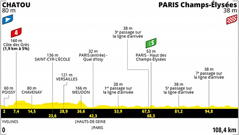 ![]() dimanche 18 juillet 2021 ![]() 16h30 (Yvelines) : D190 Chatou (km 0) - Poissy (km 2) - D30 Aigremont (près de) (km 6.2) - Côte des Grès (km 7.4-GPM4) - Feucherolles (près de) (km 10.1) - Chavenay (km 14.5) - D97 Les Grand'Maisons (km 18.2) - Villepreux (km 18.6) - D11 Fontenay-le-Fleury (km 22.4) - Saint-Cyr-l'École (km 23.6) - D10 Versailles/Château (km 28.8) - Versailles (km 28.9) - Viroflay (km 32.3) - (Hauts-de-Seine) : D910 Chaville (km 34.3) - D181 Sèvres (près de) (km 36.2) - Meudon (km 36.6) - Issy-les-Moulineaux (km 39.4) - (Paris) : Paris/entrée (km 42.3) - Bd. des Maréchaux (km 42.4) - Porte de Versailles (km 43.8) - Porte de Châtillon (km 46.3) - Pl. Denfert-Rochereau (km 47.8) - Port-Royal (km 48.5) - Jardins du Luxembourg (km 49.4) - Pl. Saint-Michel (km 50.2) - Pont-Neuf (km 50.6) - Palais du Louvre (km 51.2) - 1er passage ligne arrivée (km 53.9) - 2ème pas. (km 60.7) - 3ème pas. (km 67.5) - Hauts des Champs-Élysées (km 68.3-sprint) - 4ème pas. (km 74.3) - 5ème pas. (km 81.2) - 6ème pas. (km 88) - 7ème pas. (km 94.8) - 8ème pas. (km 101.6) - Paris/Champs-Élysées (km 108.4). ![]() ![]() ![]() Vidéo Tour de France/DailyMotion ![]() Étape : ![]() 1. Wout Van Aert (Bel) en 2h39'37" (moy : 40.75 km/h) 2. Jasper Philipsen (Bel) 3. Mark Cavendish (Gbr) 4. Luka Mezgec (Slo) 5. André Greipel (All) 6. Danny Van Poppel (Hol) 7. Michael Matthews (Aus) 8. Alex Aranburu (Esp) 9. Cyril Barthe (Fra) 10. Maximilian Walscheid (All) 11. Daniel Oss (Ita) 12. Ivan Garcia (Esp) 13. Sonny Colbrelli (Ita) 14. Silvan Dillier (Sui) 15. Magnus Cort (Dan) 16. Lukas Pöstlberger (Aut) 17. Anthony Perez (Fra) 18. Mads Pedersen (Dan) 19. Connor Swift (Gbr) 20. Jorge Arcas (Esp) 21. Cees Bol (Hol) 22. Mike Teunissen (Hol) 23. Rick Zabel (All) 24. Julien Simon (Fra) 25. Nils Eekhoff (Hol) 26. Elie Gesbert (Fra) 27. Michael Schär (Sui) 28. Kristian Sbaragli (Ita) 29. Guillaume Boivin (Can) 30. Dorian Godon (Fra) 31. Nils Politt (All) 32. Ben O'Connor (Aus) 33. Wilco Kelderman (Hol) 34. Dylan Van Baarle (Hol) 35. Valentin Madouas (Fra) 36. Sepp Kuss (Usa) 37. Christophe Laporte (Fra) 38. Marco Haller (Aut) 39. Jasper Stuyven (Bel) 40. Jan Bakelants (Bel) 41. Jonas Rickaert (Bel) 42. Michael Mørkøv (Dan) 43. Fred Wright (Gbr) 44. Alexey Lutsenko (Kaz) 45. Julien Bernard (Fra) 46. Stefan Küng (Sui) 47. Imanol Erviti (Esp) 48. Guillaume Martin (Fra) 49. Louis Meintjes (Afs) 50. Greg Van Avermaet (Bel) 51. Philippe Gilbert (Bel) 52. Alejandro Valverde (Esp) 53. Boy Van Poppel (Hol) 54. Cristian Rodriguez (Esp) 55. Jelle Wallays (Bel) 56. Enric Mas (Esp) 57. Bruno Armirail (Fra) 58. Victor De la Parte (Esp) 59. Toms Skujins (Let) 60. Mikkel Bjerg (Dan) 61. Brandon McNulty (Usa) 62. Ruben Guerreiro (Por) 63. Stefan Bissegger (Sui) 64. Jonas Rutsch (All) 65. Vegard Stake Laengen (Nor) 66. Aurélien Paret-Peintre (Fra) 67. Esteban Chaves (Col) 68. Marc Hirschi (Sui) 69. Davide Formolo (Ita) 70. Rafal Majka (Pol) 71. Nairo Quintana (Col) 72. Tadej Pogacar (Slo) 73. Rui Costa (Por) 74. Pierre Latour (Fra) 75. Pello Bilbao (Esp) 76. Lorenzo Rota (Ita) 77. Reto Hollenstein (Sui) 78. Jonathan Castroviejo (Esp) 79. Davide Ballerini (Ita) 80. Sean Bennett (Usa) 81. Neilson Powless (Usa) 82. Cyril Gautier (Fra) 83. Franck Bonnamour (Fra) 84. Carlos Barbero (Esp) 85. Ion Izagirre (Esp) 86. Maxime Chevalier (Fra) 87. Xandro Meurisse (Bel) 88. Richard Carapaz (Equ) 89. Omer Goldstein (Isr) 90. Chris Froome (Gbr) 91. Dylan Teuns (Bel) 92. Rigoberto Uran (Col) 93. Patrick Konrad (Aut) 94. Ruben Fernandez (Esp) 95. Dmitriy Gruzdev (Kaz) 96. Pierre Rolland (Fra) 97. Jonas Vingegaard (Dan) 98. Sergio Henao (Col) 99. Oliver Naesen (Bel) 100. David Gaudu (Fra) à 29" 101. Tao Geoghegan Hart (Gbr) à 36" 102. Joris Nieuwenhuis (Hol) à 39" 103. Luke Durbridge (Aus) 104. Casper Pedersen (Dan) 105. Bauke Mollema (Hol) 106. Kasper Asgreen (Dan) 107. Edward Theuns (Bel) à 45" 108. Wout Poels (Hol) 109. Thomas De Gendt (Bel) à 47" 110. Quentin Pacher (Fra) 111. Matej Mohoric (Slo) à 59" 112. Pierre-Luc Périchon (Fra) à 1'05" 113. Omar Fraile (Esp) 114. Richie Porte (Aus) à 1'26" 115. Geraint Thomas (Gbr) 116. Michal Kwiatkowski (Pol) 117. Emanuel Buchmann (All) 118. Daniel Martin (Irl) 119. Jesus Herrada (Esp) 120. Simon Geschke (All) 121. Benoit Cosnefroy (Fra) à 1'30" 122. Georg Zimmermann (All) 123. Mattia Cattaneo (Ita) 124. Dries Devenyns (Bel) à 1'56" 125. Christopher Juul-Jensen (Dan) à 2'07" 126. Fabien Doubey (Fra) à 2'11" 127. Harry Sweeny (Aus) à 2'27" 128. Simon Clarke (Aus) 129. Carlos Verona (Esp) à 2'31" 130. Jeremy Cabot (Fra) à 2'35" 131. Brent Van Moer (Bel) à 2'37" 132. Mark Donovan (Gbr) à 2'48" 133. Ide Schelling (Hol) à 3'01" 134. Petr Vakoc (Tch) à 3'29" 135. Julian Alaphilippe (Fra) 136. Michael Valgren (Dan) à 3'49" 137. Sergio Higuita (Col) 138. Tim Declercq (Bel) à 4'24" 139. Hugo Houle (Can) 140. Kenny Elissonde (Fra) à 5'58" 141. Anthony Turgis (Fra) à 12'33" Non-partant : Jakob Fuglsang (Dan) Bonifications étape : Wout Van Aert (Bel) 10" Jasper Philipsen (Bel) 6" Mark Cavendish (Gbr) 4" Classement par points : km 68.3 - Paris/Haut des Champs-Élysées (3ème pas.) 1. Stefan Bissegger (Sui) 20 pts 2. Patrick Konrad (Aut) 17 3. Harry Sweeny (Aus) 15 4. Mark Cavendish (Gbr) 13 5. Michael Mørkøv (Dan) 11 6. Michael Matthews (Aus) 10 7. Luka Mezgec (Slo) 9 8. Julian Alaphilippe (Fra) 8 9. Sonny Colbrelli (Ita) 7 10. Davide Ballerini (Ita) 6 11. Luke Durbridge (Aus) 5 12. Bruno Armirail (Fra) 4 13. Mark Donovan (Gbr) 3 14. Dries Devenyns (Bel) 2 15. Petr Vakoc (Tch) 1 Étape : 1. Wout Van Aert (Bel) 50 pts 2. Jasper Philipsen (Bel) 30 pts 3. Mark Cavendish (Gbr) 20 4. Luka Mezgec (Slo) 18 5. André Greipel (All) 16 6. Danny Van Poppel (Hol) 14 7. Michael Matthews (Aus) 12 8. Alex Aranburu (Esp) 10 9. Cyril Barthe (Fra) 8 10. Maximilian Walscheid (All) 7 11. Daniel Oss (Ita) 6 12. Ivan Garcia Cortina (Esp) 5 13. Sonny Colbrelli (Ita) 4 14. Silvan Dillier (S