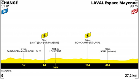 ![]() mercredi 30 juin 2021 ![]() 12h15 (Mayenne) : Changé/Rue Ch. de Gaulle (km 0) - D104 La Dombrie (km 2) - Brunard (km 3.9) - Saint-Germain-le-Fouilloux (km 4.7) - D133 Le Bissac (km 6.2) - Les Marollières (km 6.5) - Chaffenay (km 7.6) - D162 Saint-Jean-sur-Mayenne (km 8) - D131 Saint-Jean-sur-Mayenne (km 8.8-chrono) - La Clouterie (km 8.9) - La Pichonnière (km 10.1) - La Petite Lardière (km 10.3) - Louverné (km 10.9) - La Gare (km 12.5) - La Ronceray (km 13.2) - D211 Bonchamp-lès-Laval (km 16.2) - Bonchamp-lès-Laval (km 17.2-chrono) - La Chamboullière (km 19.4) - D57 Laval/entrée (km 21.2) - Laval/Parking Espace Mayenne (km 27.2). ![]() ![]() ![]() Vidéo Tour de France/DailyMotion ![]() Étape : ![]() 1. Tadej Pogacar (Slo) en 32'00" (moy : 51.43 km/h) 2. Stefan Küng (Sui) à 19" 3. Jonas Vingegaard (Dan) à 27" 4. Wout Van Aert (Bel) à 30" 5. Mathieu Van der Poel (Hol) à 31" 6. Kasper Asgreen (Dan) à 37" 7. Primoz Roglic (Slo) à 44" 8. Mattia Cattaneo (Ita) à 55" 9. Richie Porte (Aus) 10. Alexey Lutsenko (Kaz) à 1'00" 11. Mikkel Bjerg (Dan) à 1'01" 12. Magnus Cort (Dan) à 1'07" 13. Rigoberto Uran (Col) à 1'08" 14. Julian Alaphilippe (Fra) à 1'11" 15. Pierre Latour (Fra) à 1'14" 16. Geraint Thomas (Gbr) à 1'18" 17. Søren Kragh Andersen (Dan) à 1'19" 18. Stefan Bissegger (Sui) à 1'22" 19. Neilson Powless (Usa) à 1'40" 20. Luke Durbridge (Aus) à 1'42" 21. Steven Kruijswijk (Hol) 22. Anthony Perez (Fra) 23. Richard Carapaz (Equ) à 1'44" 24. Omar Fraile (Esp) à 1'46" 25. Bauke Mollema (Hol) à 1'47" 26. Enric Mas Nicolau (Esp) à 1'49" 27. Wilco Kelderman (Hol) 28. Maximilian Walscheid (All) 29. Jakob Fuglsang (Dan) à 1'52" 30. Harry Sweeny (Aus) à 1'53" 31. Ben O'Connor (Aus) à 1'56" 32. Thomas De Gendt (Bel) à 1'57" 33. Sepp Kuss (Usa) 34. Hugo Houle (Can) à 1'58" 35. Lukas Pöstlberger (Aut) à 2'00" 36. Matej Mohoric (Slo) à 2'01" 37. Xandro Meurisse (Bel) à 2'04" 38. Sergio Henao Montoya (Col) à 2'05" 39. Dylan Teuns (Bel) à 2'07" 40. Miguel Angel Lopez (Col) à 2'08" 41. Pello Bilbao (Esp) 42. Ruben Guerreiro (Por) à 2'09" 43. Jonas Rutsch (All) à 2'14" 44. David Gaudu (Fra) 45. Stefan De Bod (Afs) à 2'19" 46. Davide Ballerini (Ita) à 2'24" 47. Simon Yates (Gbr) à 2'25" 48. Emanuel Buchmann (All)2'29" 49. Vincenzo Nibali (Ita) à 2'31" 50. Toms Skujins (Lat) à 2'34" 51. Nairo Quintana (Col) à 2'36" 52. Aurélien Paret-Peintre (Fra) à 2'38" 53. Wout Poels (Hol) à 2'41" 54. Sergio Higuita (Col) à 2'45" 55. Alex Aranburu (Esp) à 2'47" 56. Lucas Hamilton (Aus) à 2'48" 57. Michael Valgren (Dan) 58. Jeremy Cabot (Fra) à 2'51" 59. Anthony Turgis (Fra) 60. Louis Meintjes (Afs) à 2'56" 61. Dorian Godon (Fra) à 3'03" 62. Esteban Chaves (Col) 63. Pierre-Luc Périchon (Fra) à 3'05" 64. Michael Schär (Sui) à 3'07" 65. Ion Izagirre (Esp) 66. Jan Bakelants (Bel) à 3'08" 67. Benoit Cosnefroy (Fra) à 3'11" 68. Anthony Delaplace (Fra) à 3'13" 69. Greg Van Avermaet (Bel) 70. Guillaume Martin (Fra) à 3'15" 71. Mark Donovan (Gbr) à 3'18" 72. Jonas Rickaert (Bel) à 3'21" 73. Connor Swift (Gbr) à 3'22" 74. Nils Eekhoff (Hol) 75. Mike Teunissen (Hol) 76. Nils Politt (All) 77. Mark Cavendish (Gbr) à 3'24" 78. Silvan Dillier (Sui) à 3'25" 79. Franck Bonnamour (Fra) à 3'32" 80. Alejandro Valverde (Esp) 81. Tony Martin (All) à 3'33" 82. Omer Goldstein (Isr) à 3'37" 83. Tiesj Benoot (Bel) à 3'41" 84. Joris Nieuwenhuis (Hol) 85. Nans Peters (Fra) à 3'42" 86. Victor De la Parte (Esp) 87. Sonny Colbrelli (Ita) 88. Daniel Oss (Ita)3'43" 89. Marco Haller (Aut) à 3'44" 90. Danny Van Poppel (Hol) à 3'47" 91. Elie Gesbert (Fra) à 3'48" 92. Imanol Erviti (Esp) 93. Jesus Herrada (Esp) à 3'49" 94. Quentin Pacher (Fra) à 3'51" 95. Victor Campenaerts (Bel) à 3'52" 96. Michael Mørkøv (Dan) 97. Casper Pedersen (Dan) 98. Michael Matthews (Aus) à 3'53" 99. Maxime Chevalier (Fra) à 3'54" 100. Fabien Doubey (Fra) à 3'55" 101. Dylan Van Baarle (Hol) 102. Guillaume Boivin (Can) à 3'59" 103. Warren Barguil (Fra) à 4'00" 104. Ruben Fernandez (Esp) à 4'01" 105. Daniel Martin (Irl) à 4'02" 106. Peter Sagan (Slq) à 4'04" 107. Lorenzo Rota (Ita) à 4'05" 108. Valentin Madouas (Fra) à 4'06" 109. Michael Woods (Can) 110. Simon Geschke (All) à 4'07" 111. Pierre Rolland (Fra) à 4'08" 112. Clément Russo (Fra) à 4'10" 113. Edvald Boasson Hagen (Nor) à 4'11" 114. Davide Formolo (Ita) 115. Dmitriy Gruzdev (Kaz) 116. Christopher Juul-Jensen (Dan) à 4'12" 117. Simon Clarke (Aus) à 4'13" 118. Oliver Naesen (Bel) à 4'15" 119. Sean Bennett (Usa) à 4'16" 120. Fred Wright (Gbr) 121. Chris Froome (Gbr) à 4'20" 122. Loïc Vliegen (Bel) à 4'21" 123. Miles Scotson (Aus) à 4'24" 124. Dries Devenyns (Bel) à 4'26" 125. Tim Declercq (Bel) 126. Petr Vakoc (Tch) 127. Jasper De Buyst (Bel) à 4'27" 128. Tosh Van Der Sande (Bel) 129. Rafal Majka (Pol) 130. Marc Hirschi (Sui) à 4'28" 131. Julien Bernard (Fra) à 4'29" 132. Cyril Barthe (Fra) à 4'30" 133. Nicholas Dlamini (Afs) à 4'31" 134. Jasper Philipsen (Bel) à 4'36" 135. Luke Rowe (Gbr) 136. Ivan Garcia Cortina (Esp) à 4'39" 137. Brent Van Moer (Bel) à 4'40" 138. Boy Van Poppel (Hol) 139. Michael Gogl (Aut) à 4'43" 140. Vegard Stake Laengen (Nor) 141. Rui Costa (Por) à 4'45" 142. Julien Simon (Fra) à 4'46" 143. Bruno Armirail (Fra) à 4'48" 144. André Greipel (All) à 4'49" 145. Arnaud Démare (Fra) à 4'53" 146. Cyril Gautier (Fra) à 4'54" 147. Rick Zabel (All) 148. Philippe Gilbert (Bel) à 4'55" 149. Cristian Rodriguez (Esp) à 4'56" 150. Jonas Koch (All) à 4'58" 151. Jorge Arcas (Esp) 152. Georg Zimmermann (All) à 5'01" 153. Cees Bol (Hol) à 5'03" 154. Edward Theuns (Bel) 155. Amund Grøndahl Jansen (Nor) à 5'04" 156. Jacopo Guarnieri (Ita) à 5'05" 157. Jasper Stuyven (Bel) à 5'07" 158. Tao Geoghegan Hart (Gbr) à 5'10" 159. Carlos Barbero (Esp) à 5'13" 160. Christophe Laporte (Fra) à 5'14" 161. Jelle Wallays (Bel) à 5'21" 162. Patrick Konrad (Aut) 163. Luka Mezgec (Slo) à 5'28" 164. D