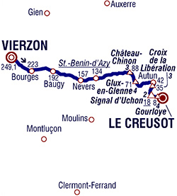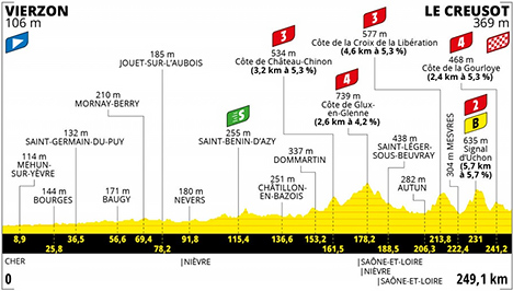 ![]() vendredi 2 juillet 2021 ![]() 11h15 (Cher) : D60 Vierzon (km 0) - Foécy (km 2.9) - Mehun-sur-Yèvre (km 8.9) - Berry-Bouy (km 18.1) - D400 Bourges (km 25.8) - N151 Saint-Germain-du-Puy (km 36.5) - Nohans-en-Goût (km 43.4) - D12 Villabon (km 51.8) - Villequiers (km km 62.4) - Mornay-Berry (km 69.4) - Saint-Hilaire-de-Gondilly (km 70.9) - Menetou-Couture (km 73.2) - Jouet-sur-l'Aubois (km 78.2) - D920 Cours-les-Barres (km 82.4) - (Nièvre) : D40 Fourchambault (km 87.6) - Marzy (km 88.2) - Nevers (km 91.8) - D978 Les Rues (km 101.4) - Saint-Benin d'Azy (km 115.4) - Rouy (km 126.4) - Châtillon-en-Bazois (km 136.6) - Tamnay-en-Bazois (km 142.5) - Dommartin (km 153.2) - Château-Chinon (km 160.8) - Côte de Château-Chinon (km 161.5-GPM3) - Le Pont Charrot (km 165.2) - D300 Côte de Glux-en-Glenne (km 178.2-GPM4) - Glux-en-Glenne (km 179.6) - (Saône-et-Loire) : D3 Col du Rebout (km 183.5) - Saint-Léger-sous-Beuvray (km 188.5) - D296 Monthelon (km 201.1) - Autun (km 206.3) - Couhard (km 209.7) - D256 Côte de la Croix de la Libération (km 213.8-GPM3) - Col de la Porolle (km 215) - D46 Mesvres (km 222.4) - D228 La-Chapelle-sous-Uchon (km 226.9) - Uchon (km 230.3) - Signal d'Uchon (km 231-GPM2-bonus) - Le Sautot (km 238.4) - Côte de la Gourloye (km 241.2-GPM4) - Montcenis (km 243.5) - Le Creusot/Av. du Stade Jean Garnier (km 249.1). ![]() ![]() ![]() Vidéo Tour de France/DailyMotion ![]() Étape : ![]() 1. Matej Mohoric (Slo) en 5h28'20" (moy : 45.52 km/h) 2. Jasper Stuyven (Bel) à 1'20" 3. Magnus Cort (Dan) à 1'40" 4. Mathieu Van der Poel (Hol) 5. Kasper Asgreen (Dan) 6. Franck Bonnamour (Fra) 7. Patrick Konrad (Aut) 8. Wout Van Aert (Bel) 9. Brent Van Moer (Bel) à 1'44" 10. Dorian Godon (Fra) à 2'45" 11. Toms Skujins (Let) 12. Hugo Houle (Can) à 2'57" 13. Vincenzo Nibali (Ita) 14. Simon Yates (Gbr) 15. Xandro Meurisse (Bel) à 4'22" 16. Philippe Gilbert (Bel) 17. Jan Bakelants (Bel) à 4'25" 18. Søren Kragh Andersen (Dan) à 4'32" 19. Julian Alaphilippe (Fra) à 5'15" 20. Enric Mas (Esp) 21. Richard Carapaz (Equ) 22. Pierre Latour (Fra) 23. Sergio Higuita (Col) 24. Alexey Lutsenko (Kaz) 25. Jonas Vingegaard (Dan) 26. Tadej Pogacar (Slo) 27. Sergio Henao (Col) 28. Bauke Mollema (Hol) 29. Pello Bilbao (Esp) 30. Esteban Chaves (Col) 31. Ben O'Connor (Aus) 32. Kenny Elissonde (Fra) 33. Louis Meintjes (Afs) 34. Richie Porte (Aus) 35. Emanuel Buchmann (All) 36. Aurélien Paret-Peintre (Fra) 37. Rigoberto Uran (Col) 38. Jakob Fuglsang (Dan) 39. David Gaudu (Fra) 40. Guillaume Martin (Fra) 41. Geraint Thomas (Gbr) 42. Steven Kruijswijk (Hol) 43. Julien Bernard (Fra) 44. Pierre Rolland (Fra) 45. Rafal Majka (Pol) 46. Lucas Hamilton (Aus) 47. Cristian Rodriguez (Esp) 48. Wilco Kelderman (Hol) 49. Miguel Angel Lopez (Col) 50. Alejandro Valverde (Esp) 51. Michal Kwiatkowski (Pol) à 5'26" 52. Jonathan Castroviejo (Esp) à 5'44" 53. Imanol Erviti (Esp) à 6'22" 54. Dylan van Baarle (Hol) à 7'00" 55. Wout Poels (Hol) m.t 56. Ivan Garcia (Esp) à 7'02" 57. Valentin Madouas (Fra) à 7'31" 58. Neilson Powless (Usa) à 7'57" 59. Thomas De Gendt (Bel) à 08'02" 60. Quentin Pacher (Fra) 61. Mattia Cattaneo (Ita) 62. Mark Donovan (Gbr) 63. Simon Geschke (All) à 9'03" 64. Warren Barguil (Fra) 65. Primoz Roglic (Slo) 66. Daniel Martin (Irl) à 9'42" 67. Michael Schär (Sui) à 10'53" 68. Victor Campenaerts (Bel) 69. Elie Gesbert (Fra) 70. Harry Sweeny (Aus) 71. Dries Devenyns (Bel) à 11'35" 72. Benoit Cosnefroy (Fra) 73. Dylan Teuns (Bel) 74. Mike Teunissen (Hol) 75. Loïc Vliegen (Bel) à 13'19" 76. Lorenzo Rota (Ita) 77. Michael Valgren (Dan) 78. Cyril Barthe (Fra) 79. Pierre-Luc Périchon (Fra) 80. Ruben Fernandez (Esp) 81. Greg Van Avermaet (Bel) 82. Jesus Herrada (Esp) 83. Bruno Armirail (Fra) 84. Sepp Kuss (Usa) 85. Sonny Colbrelli (Ita) à 15'32" 86. Nils Politt (All) 87. Stefan Küng (Sui) 88. Ion Izagirre (Esp) 89. Tim Declercq (Bel) 90. Omar Fraile Matarranz (Esp) 91. Alex Aranburu (Esp) 92. Dmitriy Gruzdev (Kaz) 93. Anthony Delaplace (Fra) 94. Marco Haller (Aut) 95. Boy Van Poppel (Hol) 96. Victor de la Parte (Esp) 97. Carlos Verona (Esp) à 16'43" 98. Stefan De Bod (Afs) à 17'34" 99. Jorge Arcas (Esp) 100. Michael Woods (Can) 101. Jonas Rickaert (Bel) 102. Christophe Laporte (Fra) à 18'05" 103. Anthony Perez (Fra) 104. Amund Grøndahl Jansen (Nor) à 18'37" 105. Edvald Boasson Hagen (Nor) 106. Nans Peters (Fra) 107. Jelle Wallays (Bel) 108. Silvan Dillier (Sui) 109. Kristian Sbaragli (Ita) 110. Chris Froome (Gbr) 111. Rick Zabel (All) 112. André Greipel (All) 113. Nils Eekhoff (Hol) 114. Jasper Philipsen (Bel) 115. Danny Van Poppel (Hol) 116. Omer Goldstein (Isr) 117. Michael Matthews (Aus) 118. Luka Mezgec (Slo) 119. Peter Sagan (Slq) 120. Daniel Oss (Ita) 121. Ruben Guerreiro (Por) 122. Anthony Turgis (Fra) 123. Connor Swift (Gbr) 124. Guillaume Boivin (Can) 125. Miles Scotson (Aus) 126. Luke Durbridge (Aus) 127. Maximilian Walscheid (All) 128. Reto Hollenstein (Sui) 129. Tony Martin (All) 130. Simon Clarke (Aus) 131. Tosh Van der Sande (Bel) 132. Carlos Barbero (Esp) 133. Tao Geoghegan Hart (Gbr) 134. Nicholas Dlamini (Afs) 135. Nairo Quintana (Col) 136. Tim Merlier (Bel) 137. Oliver Naesen (Bel) 138. Christopher Juul-Jensen (Dan) 139. Edward Theuns (Bel) 140. Georg Zimmermann (All) 141. Jasper De Buyst (Bel) 142. Bryan Coquard (Fra) 143. Maxime Chevalier (Fra) 144. Cyril Gautier (Fra) 145. Michael Gogl (Aut) 146. Lukas Pöstlberger (Aut) 147. Ide Schelling (Hol) 148. Sean Bennett (Usa) 149. Jonas Koch (All) 150. Rui Costa (Por) 151. Petr Vakoc (Tch) 152. Davide Ballerini (Ita) 153. Mark Cavendish (Gbr) à 21'13" 154. Daniel McLay (Gbr) à 23'47" 155. Joris Nieuwenhuis (Hol) 156. Mikkel Bjerg (Dan) 157. Mads Pedersen (Dan) 158. Jonas Rutsch (All) 159. Brandon McNulty (Usa) 160. Jacopo Guarnieri (Ita) 161. Davide Formolo (Ita) 162. Nacer Bouhanni (Fra) 163. Julien Simon (Fra) 164. Clément Russo (Fra) 165. Arnaud Démare (Fra) 166. Tiesj Benoot (Bel) 167. Casper Pedersen (Dan) 