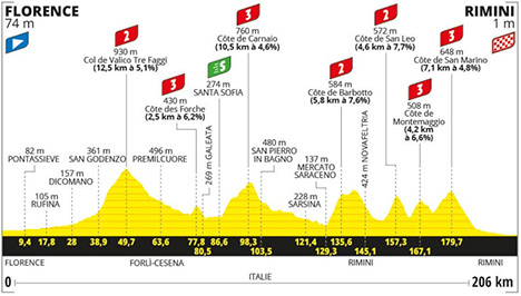 ![]() FLORENCE (Ita) > RIMINI (Ita), 206 km samedi 29 juin 2024 ![]() 12h40 (ITALIE) - (Florence) : SP34 Florence (km 0) - Pontassieve (km 9.4) - Rufina (km 17.8) - Scopeti (km 21.8) - Dicomano (km 28) - San Godenzo (km 38.9) - SP9ter Col de Valico Tre Faggi (km 49.7-GPM2) - (Forli Cesena) : Premilcuore (km 63.6) - Strada San Zeno (km 74.9) - SP24 Côte des Forche (km 77.8-GPM3) - Santa Sofia (km 86.6-sprint) - SP26 Côte de Carnaio (km 98.3)-GPM3) - SR142 Bagno di Romagna (km 113.7) - Sarsina (km 121.4) - Mercato Saraceno (km 129.3) - Côte de Barbotto (km 135.6-GPM2) - (Rimini) : Novafeltria (km 145.1) - SP22 San Leo (km 157.1) - SP89 Monternaggio (km 166.9) - Côte de Monternaggio (km 167.1-GPM3) - (Saint-Marin) : Côte de San Marino (km 179.1-GPM3) - Serravalle (km 187.9) - (Rimini) : SS72 Rimini / Lungomare Giuseppe Di Vittorio (km 206). ![]() ![]() ![]() Vidéo Tour de France / DailyMotion ![]() Étape : ![]() 1. Romain Bardet (Fra) en 5h07'22" (moy : 40.21 km/h) 2. Frank Van den Broek (Hol) 3. Wout Van Aert (Bel) à 5" 4. Tadej Pogacar (Slo) 5. Maxim Van Gils (Bel) 6. Alex Aranburu (Esp) 7. Mads Pedersen (Dan) 8. Remco Evenepoel (Bel) 9. Pello Bilbao (Esp) 10. Alberto Bettiol (Ita) 11. Thomas Pidcock (Gbr) 12. Egan Bernal (Col) 13. Ilan Van Wilder (Bel) 14. Victor Campenaerts (Bel) 15. Jai Hindley (Aus) 16. Jonas Vingegaard (Dan) 16. Jonas Vingegaard (Dan) 17. Derek Gee (Can) 18. Aleksandr Vlasov (Rus) 19. Toms Skujins (Let) 20. Geraint Thomas (Gbr) 21. Steff Cras (Bel) 22. Richard Carapaz (Equ) 23. Matteo Jorgenson (Usa) 24. Tobias Halland Johannessen (Nor) 25. Guillaume Martin (Fra) 26. Enric Mas (Esp) 27. Jack Haig (Aus) 28. Carlos Rodriguez (Esp) 29. Oscar Onley (Gbr) 30. Odd Christian Eiking (Nor) 31. Julio Ciccone (Ita) 32. Mikel Landa (Esp) 33. Johannes Kulset (Nor) 34. Primoz Roglic (Slo) 35. Laurens De Plus (Bel) 36. Simon Yates (Gbr) 37. Juan Ayuso (Esp) 38. Warren Barguil (Fra) 39. Rui Costa (Por) 40. Chris Harper (Aus) 41. Felix Gall (Aut) 42. Bruno Armirail (Fra) 43. João Almeida (Por) 44. Pavel Sivakov (Fra) 45. Adam Yates (Gbr) 46. Javier Romo (Esp) 47. Santiago Buitrago (Col) 48. Louis Meintjes (Afs) 49. Michal Kwiatkowski (Pol) à 16" 50. Ben Healy (Irl) à 18 51. Neilson Powless (Usa) à 34" 52. Wilco Keldermann (Hol) à 38" 53. Julien Bernard (Fra) à 1'24" 54. Carlos Verona (Esp) 55. Valentin Madouas (Fra) à 1'41" 56. Louis Vervaecke (Bel) à 9'00" 57. Ryan Gibbons (Afs) 58. Davide Formolo (Ita) à 14'16" 59. Jan Tratnik (Slo) 60. Bob Jungels (Lux) à 15'03" 61. Jonas Abrahamsen (Nor) 62. Harold Tejada (Col) 63. Cedric Beullens (Bel) à 18'46" 64. Nelson Oliveira (Por) 65. Hugo Page (Can) 66. Axel Laurance (Fra) 67. Paul Lapeira (Fra) 68. Quentin Pacher (Fra) 69. Cristian Rodriguez (Esp) 70. Fabien Grellier (Fra) 71. Kevin Geniets (Lux) 72. Brent Van Moer (Bel) 73. Soren Kragh Andersen (Dan) 74. Jakob Fuglsang (Dan) 75. Krists Neilands (Let) 76. Kobe Goossens (Bel) 77. Stefan Küng (Sui) 78. Marc Soler (Esp) 79. Romain Grégoire (Fra) 80. Matej Mohoric (Slo) 81. Jonathan Castroviejo (Esp) 82. Ion Izagirre (Esp) 83. Jesus Herrada (Esp) 84. Hugo Houle (Can) 85. Gianni Moscon (Ita) 86. Harm Vanhoucke (Bel) 87. Gianni Vermeersch (Bel) 88. Mathieu Van der Poel (Hol) 89. Tiesj Benoot (Bel) 90. Bart Lemmen (Hol) 91. Alexey Lutsenko (Kaz) à 24'40" 92. Magnus Cort Nielsen (Dan) 93. Rasmus Tiller (Nor) à 24'43" 94. Jasper Stuyven (Bel) 95. Nikias Arndt (All) 96. Arnaud De Lie (Bel) à 29'14" 97. Sébastien Grignard (Bel) 98. Tim Wellens (Bel) 99. Soren Wærenskjold (Nor) 100. Nils Eekhoff (Hol) 101. Arnaud Démare (Fra) 102. Nico Denz (All) 103. John Degenkolb (All) 104. Nils Politt (All) 105. Sandy Dujardin (Fra) 106. Clément Russo (Fra) 107. Tim Declercq (Bel) 108. Jordan Jegat (Fra) 109. Oliver Naesen (Bel) 110. Anthony Turgis (Fra) 111. Nans Peters (Fra) 112. Marijn Van den Berg (Hol) 113. Dorian Godon (Fra) 114. Stefan Bisseger (Sui) 115. Nicolas Prodhomme (Fra) 116. Matteo Sobrero (Ita) 117. Robbe Ghys (Bel) 118. Ben Turner (Gbr) 119. Christophe Laporte (Fra) 120. Fred Wright (Gbr) 121. Phil Bauhaus (All) 122. Biniam Girmay (Ery) 123. Casper Pedersen (Dan) 124. Sean Quinn (Usa) 125. Simon Geschke (All) 126. Danny Van Poppel (Hol) 127. Luke Durbridge (Aus) 128. Lenny Martinez (Fra) 129. Georg Zimmermann (All) 130. Mathieu Burgaudeau (Fra) 131. Christopher Juul-Jensen (Dan) 132. Piet Allegaert (Bel) 133. Mike Teunissen (Hol) 134. Wout Poels (Hol) 135. Bryan Coquard (Fra) 136. David Gaudu (Fra) 137. Stephen Williams (Gbr) 138. Guillaume Boivin (Can) 139. Kévin Vauquelin (Fra) 140. Luca Mezgec (Slo) 141. Jake Stewart (Gbr) 142. Sam Bennett (Irl) 143. Marco Haller (Aut) 144. Michael Matthews (Aus) 145. Gregor Mühlberger (Aut) 146. Pascal Ackermann (All) 147. Oier Lazcano (Esp) 148. Clément Champoussin (Fra) 149. Raul Garcia Pierna (Esp) 150. Jarrad Drizners (Aus) 151. Silvan Dillier (Sui) à 30'18" 152. Elmar Reinders (Hol) 153. Amaury Capiot (Bel) 154. Alexis Renard (Fra) 155. Thomas Gachignard (Fra) 156. Dylan Groenewegen (Hol) 157. Jasper Philipsen (Bel) 158. Yves Lampaert (Bel) 159. Laurenz Rex (Bel) 160. Alexander Kristoff (Nor) 161. Daniel McLay (Gbr) 162. Jan Hirt (Tch) 163. Gerben Thijssen (Bel) 164. Mattéo Vercher (Fra) 165. Fernando Gaviria (Col) 166. Luca Mozzato (Ita) 167. Axel Zingle (Fra) 168. Yevgeniy Fedorov (Kaz) à 39'12" 169. Davide Ballerini (Ita) 170. Jonas Rickaert (Bel) 171. Michael Morkov (Dan) 172. Bram Welten (Hol) 173. Cees Bol (Hol) 174. Mark Cavendish (Gbr) 175. Fabio Jakobsen (Hol) Abandon : Michele Gazzoli (Ita) Prix de la combativité : Frank Van den Broek (Hol) Classement général : ![]() 1. Romain Bardet (Fra) en 5h07'22" 2. Frank Van den Broek (Hol) à 4" 3. Wout Van Aert (Bel) à 11" 4. Tadej Pogacar (Slo) à 15" 5. Maxim Van Gils (Bel) 6. Alex Aranburu (Esp) 7. Mads Pedersen (Dan) 8. Remco Evenepoel (Bel) 9. Pello Bilbao (Esp) 10. Alberto Bettiol (Ita) 11. Thomas Pidcock (Gbr) 12. Egan Bernal (Col) 13. Ilan Van Wilder (Bel)