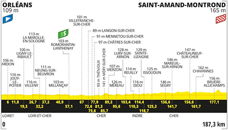 ![]() mardi 9 juillet 2024 ![]() 13h25 (Loiret) : D168 Orléans (km 0) - D7 Jouy-le-Potier (km 11.8) - Ligny-le-Ribault (km 19.3) - (Loir-et-Cher) : D113 Villeny (km 26.7) - Neung-sur-Beuvron (km 37.2) - D922 Millançay (km 48.9) - Romoranthin-Lanthenay (km 57.1-sprint) - Villefranche-sur-Cher (km 67) - Châtres-sur-Cher (km 77.9) - (Cher) : D2076 Thénioux (km 81.3) - Vierzon (km 89.2) - D918 Méreau (km 95.6) - Lury-sur-Arnon (km 103.4) - (Indre) : Reuilly (km 110.3) - Diou (km 114.4) - Sainte-Lizaigne (km 118.7) - Issoudun (km 125.3) - D9 Ségry (km 136.6) - (Cher) : D14 Mareuil-sur-Arnon (km 141.7) - Le Poireuil (km 153.4) - Châteauneuf-sur-Cher (km 156.6) - Chavannes (km 161.7) - D2144 Bruère-Allichamps (km 177.1) - Saint-Amand-Montrond / entrée (km 182.9) - D951 Saint-Amand-Montrond (km 187.3). ![]() ![]() ![]() Vidéo Tour de France / DailyMotion ![]() Étape : maillot à venir 1. Jasper Philipsen (Bel) en 4h20'06" (moy : 43.21 km/h) 2. Biniam Girmay (Ery) 3. Pascal Ackermann (All) 4. Wout Van Aert (Bel) 5. Fernando Gaviria (Col) 6. Sam Bennett (Irl) 7. John Degenkolb (All) 8. Phil Bauhaus (All) 9. Dylan Groenewegen (Hol) 10. Axel Zingle (Fra) 11. Marijn Van den Berg (Hol) 12. Oliver Naesen (Bel) 13. Bryan Coquard (Fra) 14. Ryan Gibbons (Afs) 15. Mathieu Van der Poel (Hol) 16. Alexander Kristoff (Nor) 17. Arnaud De Lie (Bel) 18. Mark Cavendish (Gbr) 19. Clément Russo (Fra) 20. Anthony Turgis (Fra) 21. Mike Teunissen (Hol) 22. Amaury Capiot (Bel) 23. Arnaud Démare (Fra) 24. Nikias Arndt (All) 25. Daniel McLay (Gbr) 26. Bob Jungels (Lux) 27. Tiesj Benoot (Bel) 28. Jonas Vingegaard (Dan) 29. Tadej Pogacar (Slo) 30. Matteo Jorgenson (Usa) 31. Carlos Rodriguez (Esp) 32. Laurenz Rex (Bel) 33. Mikel Landa (Esp) 34. Nelson Oliveira (Por) 35. João Almeida (Por) 36. Bram Welten (Hol) 37. Jai Hindley (Aus) 38. Egan Bernal (Col) 39. Magnus Cort Nielsen (Dan) 40. Primoz Roglic (Slo) 41. Jack Haig (Aus) 42. Victor Campenaerts (Bel) 43. Pello Bilbao (Esp) 44. Ben Healy (Irl) 45. Matteo Sobrero (Ita) 46. Remco Evenepoel (Bel) 47. Julio Ciccone (Ita 48. Yves Lampaert (Bel) 49. Adam Yates (Gbr) 50. Julien Bernard (Fra 51. Christophe Laporte (Fra) 52. Cedric Beullens (Bel) 53. Derek Gee (Can) 54. Robbe Ghys (Bel) 55. Stefan Küng (Sui) 56. Thomas Gachignard (Fra) 57. Nils Eekhoff (Hol) 58. Gianni Moscon (Ita) 59. Dorian Godon (Fra) 60. Juan Ayuso (Esp) 61. Jake Stewart (Gbr) 62. Guillaume Martin (Fra) 63. Santiago Buitrago (Col) 64. Steff Cras (Bel) 65. Tim Wellens (Bel) 66. Toms Skujins (Let 67. Romain Grégoire (Fra) 68. Louis Meintjes (Afs) 69. Jordan Jegat (Fra) 70. Enric Mas (Esp) 71. Nans Peters (Fra) 72. Odd Christian Eiking (Nor) 73. Paul Lapeira (Fra) 74. Felix Gall (Aut) 75. Fabien Grellier (Fra) 76. Valentin Madouas (Fra) 77. Geraint Thomas (Gbr) 78. Laurens De Plus (Bel) 79. Nicolas Prodhomme (Fra) 80. David Gaudu (Fra) 81. Georg Zimmermann (All) 82. Bruno Armirail (Fra) 83. Wilco Keldermann (Hol) 84. Javier Romo (Esp) 85. Marco Haller (Aut) 86. Tim Declercq (Bel 87. Soren Kragh Andersen (Dan) 88. Ilan Van Wilder (Bel) 89. Kobe Goossens (Bel) 90. Cristian Rodriguez (Esp) 91. Ion Izagirre (Esp) 92. Piet Allegaert (Bel) 93. Quentin Pacher (Fra) 94. Simon Yates (Gbr) 95. Alex Aranburu (Esp) 96. Oier Lazcano (Esp) 97. Simon Geschke (All) 98. Raul Garcia Pierna (Esp) 99. Brent Van Moer (Bel) 100. Jonas Rickaert (Bel) 101. Guillaume Boivin (Can) 102. Jasper Stuyven (Bel 103. Johannes Kulset (Nor) 104. Maxim Van Gils (Bel) 105. Tobias Halland Johannessen (Nor) 106. Mathieu Burgaudeau (Fra) 107. Nils Politt (All) 108. Kevin Geniets (Lux) 109. Oscar Onley (Gbr) 110. Wout Poels (Hol) 111. Danny Van Poppel (Hol) 112. Elmar Reinders (Hol) 113. Michael Matthews (Aus) 114. Nico Denz (All) 115. Davide Formolo (Ita) 116. Carlos Verona (Esp 117. Frank Van den Broek (Hol) 118. Warren Barguil (Fra) 119. Alberto Bettiol (Ita) 120. Harm Vanhoucke (Bel) 121. Stefan Bisseger (Sui) 122. Pavel Sivakov (Fra) 123. Clément Champoussin (Fra) 124. Krists Neilands (Let) 125. Hugo Houle (Can) 126. Michal Kwiatkowski (Pol) 127. Mattéo Vercher (Fra) 128. Jarrad Drizners (Aus) 129. Sébastien Grignard (Fra) 130. Fabio Jakobsen (Hol) 131. Kévin Vauquelin (Fra) 132. Alexis Renard (Fra) 133. Christopher Juul-Jensen (Dan) 134. Romain Bardet (Fra) 135. Jonas Abrahamsen (Nor) 136. Gregor Mühlberger (Aut) 137. Michael Morkov (Dan) 138. Soren Wærenskjold (Nor) à 43" 139. Stephen Williams (Gbr) 140. Luca Mezgec (Slo) 141. Luke Durbridge (Aus) 142. Cees Bol (Hol) 143. Thomas Pidcock (Gbr) à 55" 144. Fred Wright (Gbr) 145. Hugo Page (Can) 146. Axel Laurance (Fra) 147. Gianni Vermeersch (Bel) 148. Louis Vervaecke (Bel) à 1'04" 149. Luca Mozzato (Ita) à 1'16" 150. Rui Costa (Por) 151. Neilson Powless (Usa) 152. Matej Mohoric (Slo) 153. Richard Carapaz (Equ) 154. Chris Harper (Aus) 155. Lenny Martinez (Fra) 156. Silvan Dillier (Sui) 157. Rasmus Tiller (Nor) à 1'26" 158. Jakob Fuglsang (Dan) 159. Sandy Dujardin (Fra) 160. Jonathan Castroviejo (Esp) 161. Jesus Herrada (Esp) 162. Harold Tejada (Col) 163. Gerben Thijssen (Bel) 164. Bart Lemmen (Hol) 165. Alexey Lutsenko (Kaz) 166. Yevgeniy Fedorov (Kaz) 167. Marc Soler (Esp) à 1'52" 168. Jan Tratnik (Slo) 169. Davide Ballerini (Ita) 170. Sean Quinn (Usa) à 2'07" 171. Jan Hirt (Tch) 172. Ben Turner (Gbr) à 3'00" Non-partant : Aleksandr Vlasov (Rus) Prix de la combativité : Kobe Goossens (Bel) Classement général : ![]() 1. Tadej Pogacar (Slo) en 40h02'48" 2. Remco Evenepoel (Bel) à 33" 3. Jonas Vingegaard (Dan) à 1'15" 4. Primoz Roglic (Slo) à 1'36" 5. Juan Ayuso (Esp) à 2'16" 6. João Almeida (Por) à 2'17" 7. Carlos Rodriguez (Esp) à 2'31" 8. Mikel Landa (Esp) à 3'35" 9. Derek Gee (Can) à 4'02" 10. Matteo Jorgenson (Usa) à 4'03" 11. Adam Yates (Gbr) à 4'56" 12. Egan Bernal (Col) à 5'25" 13. Giulio Ciccone (Ita) à 5'35" 14. Santiago Buitrago (Col) à 5'53" 15. Pello Bilbao (Esp) à 5'58" 16. Felix Gall (Aut) à 6'06" 17. Jai Hindley (Aus) à 6'24" 18. Enric 