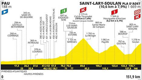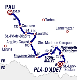 ![]() samedi 13 juillet 2024 ![]() 13h15 (Pyrénées-Atlantiques) : D802 Pau (km 0) - D938 Coarraze (km 17.3) - Igon (km 19.4) - D937 Lestelle-Bétharram (km 23) - Montaut (km 24.7) - (Hautes-Pyrénées) : Saint-Pé-de-Bigorre (km 28.2) - Peyrouse (km 32.9) - Lourdes (km 37.6) - D921b Agos-Vidalos (km 47.3) - Argelès-Gazost (km 52) - Lau-Balagnas (km 53.7) - Adast (km 56.2) - Pierrefitte-Nestalas (km 57.5) - Soulom (km 58.7) - Esquièze-Sère (km 70.2-sprint) - Luz-Saint-Sauveur (km 70.2) - D918 Esterre (km 71) - Betpouey (km 75.4) - Barrèges (km 77) - Le Tratet (km 78.9) - Col du Tourmalet (km 89.6-GPM.HC) - La Mongie (km 93.2) - Las Basses (km 104.4) - Les Bulanettes (km 104.7) - Sainte-Marie-de-Campan (km 106.3) - Payolle (km 113.1) - D113 Hourquette d'Ancizan (km 123.4-GPM2) - Guchen (km 133.3) - Bourisp (km 137.8) - Saint-Lary-Soulan (km 138.7) - D123 Soulan (km 146) - Saint-Lary-Soulan / Pla d'Adet (km 151.9-GPM.HC). ![]() ![]() ![]() Vidéo Tour de France / DailyMotion ![]() Étape : ![]() 1. Tadej Pogacar (Slo) en 4h01'51" (moy : 37.69 km/h) 2. Jonas Vingegaard (Dan) à 39" 3. Remco Evenepoel (Bel) à 1'10" 4. Carlos Rodriguez (Esp) à 1'19" 5. Giulio Ciccone (Ita) à 1'23" 6. Santiago Buitrago (Col) 7. Adam Yates (Gbr) 8. Felix Gall (Aut) à 1'26" 9. Matteo Jorgenson (Usa) à 1'29" 10. Derek Gee (Can) 11. Mikel Landa (Esp) 12. João Almeida (Por) à 1'31" 13. Simon Yates (Gbr) à 1'33" 14. Richard Carapaz (Equ) à 2'28" 15. Louis Meintjes (Afs) à 3'10" 16. Ben Healy (Irl) à 3'27" 17. Guillaume Martin (Fra) à 4'01" 18. Gregor Mühlberger (Aut) à 4'09" 19. Chris Harper (Aus) 20. Egan Bernal (Col) 21. Steff Cras (Bel) à 4'36" 22. Javier Romo (Esp) à 5'02" 23. Tobias Halland Johannessen (Nor) à 5'20" 24. Jordan Jegat (Fra) à 8'01" 25. Wilco Keldermann (Hol) à 8'40" 26. Wout Poels (Hol) à 9'36" 27. Odd Christian Eiking (Nor) à 10'13" 28. Cristian Rodriguez (Esp) 29. Jakob Fuglsang (Dan) à 10'45" 30. Ilan Van Wilder (Bel) à 10'53" 31. Oier Lazcano (Esp) à 10'54" 32. Pavel Sivakov (Fra) à 11'00" 33. Laurens De Plus (Bel) 34. Nicolas Prodhomme (Fra) 35. Jan Hirt (Tch) à 11'57" 36. Valentin Madouas (Fra) à 12'29" 37. Julien Bernard (Fra 38. Bruno Armirail (Fra) 39. Carlos Verona (Esp 40. David Gaudu (Fra) 41. Marc Soler (Esp) à 13'44" 42. Jack Haig (Aus) à 14'32" 43. Matteo Sobrero (Ita) à 14'42" 44. Bob Jungels (Lux) à 15'25" 45. Michal Kwiatkowski (Pol) 46. Jonathan Castroviejo (Esp) 47. Jan Tratnik (Slo) à 17'17" 48. Romain Grégoire (Fra) à 17'22" 49. Kevin Geniets (Lux) 50. Jai Hindley (Aus) 51. Stephen Williams (Gbr) 52. Oscar Onley (Gbr) 53. Romain Bardet (Fra) à 17'26" 54. Warren Barguil (Fra) à 17'51" 55. Harold Tejada (Col) à 20'10" 56. Enric Mas (Esp) à 21'14" 57. Quentin Pacher (Fra) 58. Alexey Lutsenko (Kaz) 59. Mathieu Van der Poel (Hol) à 22'55" 60. Magnus Cort Nielsen (Dan) 61. Sean Quinn (Usa) 62. Maxim Van Gils (Bel) à 24'16" 63. Axel Laurance (Fra) à 24'48" 64. Bart Lemmen (Hol) à 25'29" 65. Tiesj Benoot (Bel) à 25'30" 66. Johannes Kulset (Nor) à 26'21" 67. Nils Politt (All) à 26'55" 68. Marco Haller (Aut) 69. Simon Geschke (All) 70. Rui Costa (Por) 71. Christopher Juul-Jensen (Dan) 72. Fabien Grellier (Fra) à 27'03" 73. Jasper Stuyven (Bel) à 27'17" 74. Gianni Moscon (Ita) à 27'22" 75. Kobe Goossens (Bel) à 27'35" 76. Tim Wellens (Bel) 77. Jonas Abrahamsen (Nor) à 30'52" 78. Nans Peters (Fra) 79. Paul Lapeira (Fra) 80. Oliver Naesen (Bel) 81. Brent Van Moer (Bel) 82. Davide Formolo (Ita) 83. Krists Neilands (Let) 84. Stefan Küng (Sui) 85. Nelson Oliveira (Por) 86. Dorian Godon (Fra) 87. Clément Champoussin (Fra) 88. Kévin Vauquelin (Fra) 89. Hugo Houle (Can) 90. Toms Skujins (Let) à 31'04" 91. Geraint Thomas (Gbr) 92. Jake Stewart (Gbr) à 31'14" 93. Victor Campenaerts (Bel) 94. Soren Wærenskjold (Nor) à 32'07" 95. Raul Garcia Pierna (Esp) à 33'17" 96. Silvan Dillier (Sui) à 33'33" 97. Stefan Bisseger (Sui) 98. Ryan Gibbons (Afs 99. Neilson Powless (Usa) 100. Clément Russo (Fra) 101. Georg Zimmermann (All) 102. Piet Allegaert (Bel) 103. Nico Denz (All) à 33'42" 104. Thomas Gachignard (Fra) à 33'55" 105. Anthony Turgis (Fra) à 34'08" 106. Sandy Dujardin (Fra) 107. Bryan Coquard (Fra) à 34'17" 108. Cedric Beullens (Bel) à 35'25" 109. Rasmus Tiller (Nor) 110. Danny Van Poppel (Hol) 111. Yves Lampaert (Bel) 112. Sébastien Grignard (Fra) 113. Wout Van Aert (Bel) 114. Laurenz Rex (Bel) 115. Frank Van den Broek (Hol) 116. Axel Zingle (Fra) 117. Hugo Page (Can) 118. Lenny Martinez (Fra) 119. Arnaud De Lie (Bel) 120. Christophe Laporte (Fra) 121. Nils Eekhoff (Hol) 122. John Degenkolb (All) 123. Michael Matthews (Aus) 124. Matej Mohoric (Slo) 125. Biniam Girmay (Ery) 126. Mike Teunissen (Hol) 127. Mathieu Burgaudeau (Fra) 128. Alex Aranburu (Esp) 129. Mattéo Vercher (Fra) 130. Nikias Arndt (All) à 35'41" 131. Marijn Van den Berg (Hol) 132. Luca Mozzato (Ita) à 35'57" 133. Gianni Vermeersch (Bel) à 36'17" 134. Jasper Philipsen (Bel) 135. Phil Bauhaus (All) 136. Jarrad Drizners (Aus) 137. Pascal Ackermann (All) 138. Ben Turner (Gbr) à 36'57" 139. Daniel McLay (Gbr) 140. Robbe Ghys (Bel) à 38'36" 141. Elmar Reinders (Hol) à 38'48" 142. Luca Mezgec (Slo) 143. Luke Durbridge (Aus) 144. Bram Welten (Hol) 145. Dylan Groenewegen (Hol) 146. Alexander Kristoff (Nor) 147. Sam Bennett (Irl) à 39'05" 148. Fernando Gaviria (Col) à 39'20" 149. Harm Vanhoucke (Bel) à 39'50" 150. Arnaud Démare (Fra) à 40'05" 151. Davide Ballerini (Ita) à 40'36" 152. Gerben Thijssen (Bel) 153. Mark Cavendish (Gbr) 154. Cees Bol (Hol) Non-partant : Guillaume Boivin (Can) Thomas Pidcock (Gbr) Abandon : Louis Vervaecke (Bel) Alberto Bettiol (Ita) Amaury Capiot (Bel) Prix de la combativité : Ben Healy (Irl) Classement général : ![]() 1. Tadej Pogacar (Slo) en 56h42'39" 2. Jonas Vingegaard (Dan) à 1'57" 3. Remco Evenepoel (Bel) à 2'22" 4. João Almeida (Por) à 6'01" 5. Carlos Rodriguez (Esp) à 6'09" 6. Mikel Landa (Esp) à 7'17" 7. Adam Yate