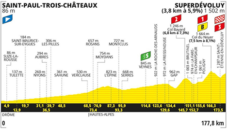 ![]() mercredi 17 juillet 2024 ![]() 12h55 (Drôme) : D59 Saint-Paul-Trois-Châteaux (km 0) - Suze-la-Rousse (km 4.9) - D94 Tulette (km 12.9) - Saint-Maurice-sur-Eygues (km 19.7) - Nyons (km 31.1) - Aubres (km 36.5) - Les Pilles (km 39.7) - Pont de Curnier (km 44.2) - Sahune (km 48.5) - La Combe (km 61) - Verclause (km 68.5) - (Hautes-Alpes) : D994 Rosans (km 73.4) - Moydans (km 76.9) - L'Épine (km 87.3) - Montclus (km 93.3) - Serres (km 95.9) - D994 La Garenne (km 100.3) - Pont-de-Chambestan (km 104.8) - Veynes (km 114.8-sprint) - La-Roche-des-Arnauds (km 123.6) - La Freissinouse (km 129.6) - Gap (km 134.4) - N85 Col Bayard (km 145.7-GPM2) - Brutinel (km 151.1) - La-Fare-en-Champsaur (km 152.7) - D17 Poligny (km 155.6) - D17t Col du Noyer (km 166.3-GPM1) - Truziaud (km 170.9) - D17 Saint-Étienne-en-Dévoluy (km 173.5) - D17b Les Cyprières (km 174.6) - Superdévoluy (km 177.8-GPM3). ![]() ![]() ![]() Vidéo Tour de France / DailyMotion ![]() Étape : ![]() 1. Richard Carapaz (Equ) en 4h06'13" (moy : 43.33 km/h) 2. Simon Yates (Gbr) à 37" 3. Enric Mas (Esp) à 57" 4. Laurens De Plus (Bel) à 1'44" 5. Oscar Onley (Gbr) 6. Guillaume Martin (Fra) à 2'36" 7. Magnus Cort Nielsen (Dan) à 2'38" 8. Wout Poels (Hol) à 2'39" 9. Jordan Jegat (Fra) 10. Alex Aranburu (Esp) 11. Toms Skujins (Let) 12. Stephen Williams (Gbr) 13. Louis Meintjes (Afs) 14. Bruno Armirail (Fra) 15. Steff Cras (Bel) à 2'48" 16. Valentin Madouas (Fra) à 2'53" 17. Bob Jungels (Lux) 18. Julien Bernard (Fra) à 2'58" 19. Johannes Kulset (Nor) à 4'17" 20. Quentin Pacher (Fra) à 4'44" 21. Odd Christian Eiking (Nor) à 5'34" 22. Cristian Rodriguez (Esp) 23. Harm Vanhoucke (Bel) à 6'52" 24. Marco Haller (Aut) 25. Romain Grégoire (Fra) à 6'58" 26. Remco Evenepoel (Bel) à 7'13" 27. Tadej Pogacar (Slo) à 7'23" 28. Jonas Vingegaard (Dan) à 7'25" 29. Pavel Sivakov (Fra) à 7'35" 30. Tiesj Benoot (Bel) à 7'48" 31. Jan Hirt (Tch) à 8'07" 32. Romain Bardet (Fra) à 8'15" 33. Wout Van Aert (Bel) à 8'26" 34. Warren Barguil (Fra) à 8'36" 35. Stefan Küng (Sui) à 9'03" 36. Jonas Abrahamsen (Nor) 37. Georg Zimmermann (All) à 9'17" 38. Derek Gee (Can) à 9'26" 39. Santiago Buitrago (Col) 40. Felix Gall (Aut) 41. Julio Ciccone (Ita 42. João Almeida (Por) 43. Adam Yates (Gbr) 44. Carlos Rodriguez (Esp) 45. Mikel Landa (Esp) 46. Ilan Van Wilder (Bel) 47. Matteo Jorgenson (Usa) 48. Carlos Verona (Esp 49. Harold Tejada (Col) 50. Dorian Godon (Fra) à 9'59" 51. Jack Haig (Aus) à 10'22" 52. Egan Bernal (Col) 53. Christophe Laporte (Fra) à 12'41" 54. Wilco Keldermann (Hol) à 12'45" 55. Javier Romo (Esp) à 15'41" 56. Jonathan Castroviejo (Esp) 57. Jai Hindley (Aus) 58. Marc Soler (Esp) 59. Lenny Martinez (Fra) 60. Christopher Juul-Jensen (Dan) 61. Jakob Fuglsang (Dan) à 16'48" 62. Nicolas Prodhomme (Fra) 63. Neilson Powless (Usa) à 17'30" 64. Ben Healy (Irl) 65. Clément Russo (Fra) 66. Davide Formolo (Ita) 67. Nans Peters (Fra) 68. Oliver Naesen (Bel) 69. Matteo Sobrero (Ita) 70. Kobe Goossens (Bel) 71. Thomas Gachignard (Fra) 72. Krists Neilands (Let) 73. David Gaudu (Fra) à 18'21" 74. Geraint Thomas (Gbr) 75. Ryan Gibbons (Afs) à 18'40" 76. Kévin Vauquelin (Fra) à 19'09" 77. Raul Garcia Pierna (Esp) 78. Bart Lemmen (Hol) 79. Nelson Oliveira (Por) à 19'41" 80. Jasper Stuyven (Bel) à 19'48" 81. Nils Politt (All) à 19'59" 82. Arnaud De Lie (Bel) à 22'39" 83. Ben Turner (Gbr) à 24'28" 84. Axel Laurance (Fra) à 24'35" 85. Sébastien Grignard (Fra) 86. Axel Zingle (Fra) 87. Tobias Halland Johannessen (Nor) à 24'39" 88. Rasmus Tiller (Nor) 89. Simon Geschke (All) 90. Cedric Beullens (Bel) à 24'52" 91. Brent Van Moer (Bel) 92. Jake Stewart (Gbr) 93. Pascal Ackermann (All) 94. Paul Lapeira (Fra) 95. Luca Mezgec (Slo) 96. Jan Tratnik (Slo) 97. Michael Matthews (Aus) 98. Luke Durbridge (Aus) 99. Danny Van Poppel (Hol) 100. Mathieu Van der Poel (Hol) 101. Nikias Arndt (All) 102. Sean Quinn (Usa) 103. Rui Costa (Por) 104. Alexander Kristoff (Nor) 105. Marijn Van den Berg (Hol) 106. Stefan Bisseger (Sui) 107. Hugo Houle (Can) 108. Mathieu Burgaudeau (Fra) 109. Mike Teunissen (Hol) 110. Laurenz Rex (Bel) 111. Matej Mohoric (Slo) 112. Bryan Coquard (Fra) 113. Nico Denz (All) 114. Dylan Groenewegen (Hol) 115. Biniam Girmay (Ery) 116. Oier Lazcano (Esp) 117. Gregor Mühlberger (Aut) à 24'59" 118. Sandy Dujardin (Fra) 119. Mattéo Vercher (Fra) 120. Piet Allegaert (Bel) 121. Gianni Moscon (Ita) à 25'32" 122. Gianni Vermeersch (Bel) à 27'14" 123. Yves Lampaert (Bel) 124. Tim Wellens (Bel) 125. Frank Van den Broek (Hol) 126. Nils Eekhoff (Hol) 127. John Degenkolb (All) 128. Michal Kwiatkowski (Pol) 129. Silvan Dillier (Sui) 130. Clément Champoussin (Fra) 131. Luca Mozzato (Ita) 132. Anthony Turgis (Fra) 133. Mark Cavendish (Gbr) 134. Arnaud Démare (Fra) 135. Victor Campenaerts (Bel) 136. Jasper Philipsen (Bel) 137. Kevin Geniets (Lux) 138. Hugo Page (Can) 139. Daniel McLay (Gbr) 140. Fabien Grellier (Fra) 141. Jarrad Drizners (Aus) 142. Soren Wærenskjold (Nor) à 27'38" 143. Davide Ballerini (Ita) à 27'52" 144. Cees Bol (Hol) 145. Robbe Ghys (Bel) à 28'32" Non-partant : Phil Bauhaus (All) Elmar Reinders (Hol) Abandon : Sam Bennett (Irl) Fernando Gaviria (Col) Alexey Lutsenko (Kaz) Prix de la combativité : Romain Grégoire (Fra) Classement général : ![]() 1. Tadej Pogacar (Slo) en 70h21'27" 2. Jonas Vingegaard (Dan) à 3'11" 3. Remco Evenepoel (Bel) à 5'09" 4. João Almeida (Por) à 12'57" 5. Mikel Landa (Esp) à 13'24" 6. Carlos Rodriguez (Esp) à 13'30" 7. Adam Yates (Gbr) à 15'41" 8. Giulio Ciccone (Ita) à 17'51" 9. Derek Gee (Can) à 18'15" 10. Santiago Buitrago (Col) à 18'35" 11. Felix Gall (Aut) à 19'04" 12. Matteo Jorgenson (Usa) à 22'18" 13. Simon Yates (Gbr) à 28'12" 14. Steff Cras (Bel) à 32'58" 15. Laurens De Plus (Bel) à 33'17" 16. Guillaume Martin (Fra) à 33'41" 17. Ben Healy (Irl) à 39'33" 18. Richard Carapaz (Equ) à 51'41" 19. Jai Hindley (Aus) à 54'09" 20. Javier Romo (Esp) à 56'23" 21. Enric 