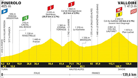 ![]() mardi 2 juillet 2024 ![]() 13h20 (ITALIE) - (Turin) : SR23 Pinerolo (km 0) - Porte (km 0.2) - SP23R Villar Perosa (km 4.2) - Pinasca (km 8.9) - Perosa Argentina (km 12.5) - Castel del Bosco (km 18.9-sprint) - Pourrieres (km 34.4) - Duc (km 45.8) - Sestrières (km 50.4-GPM2) - Champlas du Col (km 54.7) - SS24 Cesana Torinese (km 62.8) - Claviere (km 68.4) - (FRANCE) - (Hautes-Alpes) : N94 Montgenèvre (km 70.6) - Col de Montgenèvre (km 71.1-GPM2) - La Vachette (km 79.2) - Briançon (km 82.1) - D1091 Saint-Chaffrey (km 89.3) - Chantemerle (km 90.4) - La-Salle-les-Alpes (km 92) - Le-Monêtier-les-Bains (km 97.9) - Col du Lautaret (km 112.1) - (Savoie) : D902 Col du Galibier (km 120.7-GPM.HV-Souv. H.Desgrange) - Plan Lachat (km 128.8) - Bonnenuit (km 132.9) - Valloire / entrée (km 135.7) - Valloire / Av. de la Vallée d'Or (km 139.6). ![]() ![]() ![]() Vidéo Tour de France / DailyMotion ![]() Étape : ![]() 1. Tadej Pogacar (Slo) en 3h46'38" (moy : 36.96 km/h) 2. Remco Evenepoel (Bel) à 35" 3. Juan Ayuso (Esp) 4. Primoz Roglic (Slo) 5. Jonas Vingegaard (Dan) à 37" 6. Carlos Rodriguez (Esp) 7. Mikel Landa (Esp) à 53" 8. João Almeida (Por) 9. Giulio Ciccone (Ita) à 2'41" 10. Santiago Buitrago (Col) 11. Gall Felix (Aut) à 2'42" 12. Matteo Jorgenson (Usa) 13. Egan Bernal (Col) 14. Adam Yates (Gbr) 15. Geraint Thomas (Gbr) 16. Aleksandr Vlasov (Rus) à 3'05" 17. Derek Gee (Can) à 3'07" 18. Ilan Van Wilder (Bel) à 4'01" 19. Gregor Mühlberger (Aut) 20. Guillaume Martin (Fra) 21. Louis Meintjes (Afs) 22. Steff Cras (Bel) 23. Pello Bilbao (Esp) 24. Jai Hindley (Aus) 25. Enric Mas (Esp) 26. Jack Haig (Aus) 27. Simon Yates (Gbr) 28. Laurens De Plus (Bel) 29. Jan Hirt (Tch) à 4'07" 30. Chris Harper (Aus) à 4'08" 31. Ben Healy (Irl) à 5'10" 32. Richard Carapaz (Equ) 33. Jordan Jegat (Fra) à 7'20" 34. Georg Zimmermann (All) 35. Javier Romo (Esp) 36. Jakob Fuglsang (Dan) 37. Carlos Verona (Esp 38. Cristian Rodriguez (Esp) à 7'26" 39. Odd Christian Eiking (Nor) 40. Nans Peters (Fra) à 8'32" 41. Louis Vervaecke (Bel) 42. Oscar Onley (Gbr) à 9'53" 43. Romain Bardet (Fra) 44. Wilco Keldermann (Hol) à 10'31" 45. Jan Tratnik (Slo) à 11'34" 46. Sean Quinn (Usa) 47. Tobias Halland Johanessen (Nor) 48. Tiesj Benoot (Bel) à 11'44" 49. Bob Jungels (Lux) 50. Stephen Williams (Gbr) 51. Wout Poels (Hol) 52. Romain Grégoire (Fra) 53. Bruno Armirail (Fra) 54. Nicolas Prodhomme (Fra) 55. Pavel Sivakov (Fra) 56. Thomas Pidcock (Gbr) 57. Warren Barguil (Fra) 58. Davide Formolo (Ita) 59. Valentin Madouas (Fra) 60. David Gaudu (Fra) 61. Marc Soler (Esp) 62. Kobe Goossens (Bel) 63. Julien Bernard (Fra) à 13'34" 64. Christopher Juul-Jensen (Dan) à 13'48" 65. Alberto Bettiol (Ita) à 14'28" 66. Jonathan Castroviejo (Esp) à 14'51" 67. Oier Lazcano (Esp) 68. Maxim Van Gils (Bel) à 15'25" 69. Simon Geschke (All) 70. Johannes Kulset (Nor) 71. Neilson Powless (Usa) 72. Mathieu Burgaudeau (Fra) 73. Toms Skujins (Let 74. Krists Neilands (Let) 75. Gianni Moscon (Ita) 76. Tim Wellens (Bel) à 17'01" 77. Dorian Godon (Fra) 78. Magnus Cort Nielsen (Dan) à 17'06" 79. Bart Lemmen (Hol) à 17'10" 80. Frank Van den Broek (Hol) 81. Matteo Sobrero (Ita) 82. Marco Haller (Aut) 83. Nelson Oliveira (Por) 84. Thomas Gachignard (Fra) 85. Mathieu Van der Poel (Hol) à 17'18" 86. Raul Garcia Pierna (Esp) à 20'06" 87. Alexey Lutsenko (Kaz) 88. Paul Lapeira (Fra) à 20'44" 89. Jasper Stuyven (Bel 90. Kevin Geniets (Lux) 91. Quentin Pacher (Fra) 92. Oliver Naesen (Bel) 93. Rui Costa (Por) 94. Stefan Küng (Sui) 95. Nico Denz (All) 96. Ion Izagirre (Esp) 97. Hugo Houle (Can) 98. Michael Matthews (Aus) à 21'47" 99. Stefan Bisseger (Sui) à 22'38" 100. Jesus Herrada (Esp) à 23'00" 101. Nils Politt (All) à 24'04" 102. Ben Turner (Gbr) à 24'13" 103. Michal Kwiatkowski (Pol) 104. Alex Aranburu (Esp) à 24'24" 105. Christophe Laporte (Fra) 106. Harold Tejada (Col) 107. Mattéo Vercher (Fra) à 26'05" 108. Danny Van Poppel (Hol) à 26'45" 109. Matej Mohoric (Slo) à 26'47" 110. Luca Mezgec (Slo) 111. Fred Wright (Gbr) 112. Jake Stewart (Gbr) 113. Nikias Arndt (All) 114. Luke Durbridge (Aus) 115. Bryan Coquard (Fra) 116. Sandy Dujardin (Fra) 117. Harm Vanhoucke (Bel) 118. Fabien Grellier (Fra) 119. Brent Van Moer (Bel) 120. Wout Van Aert (Bel) 121. Clément Champoussin (Fra) à 26'57" 122. Ryan Gibbons (Afs 123. Mads Pedersen (Dan) à 26'58" 124. Marijn Van den Berg (Hol) à 29'21" 125. Mike Teunissen (Hol) 126. Guillaume Boivin (Can) à 30'37" 127. Tim Declercq (Bel 128. John Degenkolb (All) 129. Clément Russo (Fra) à 30'48" 130. Yevgeniy Fedorov (Kaz) 131. Davide Ballerini (Ita) 132. Piet Allegaert (Bel) à 30'51" 133. Soren Kragh Andersen (Dan) à 30'53" 134. Yves Lampaert (Bel) à 31'20" 135. Kévin Vauquelin (Fra) à 31'21" 136. Anthony Turgis (Fra) 137. Pascal Ackermann (All) à 32'01" 138. Axel Zingle (Fra) à 33'53" 139. Arnaud De Lie (Bel) à 34'27" 140. Victor Campenaerts (Bel) 141. Jonas Abrahamsen (Nor) 142. Hugo Page (Can) 143. Cedric Beullens (Bel) 144. Laurenz Rex (Bel) 145. Biniam Girmay (Ery) 146. Amaury Capiot (Bel) 147. Alexis Renard (Fra) 148. Phil Bauhaus (All) 149. Daniel McLay (Gbr) 150. Luca Mozzato (Ita) 151. Axel Laurance (Fra) 152. Jonas Rickaert (Bel) 153. Rasmus Tiller (Nor) 154. Sébastien Grignard (Fra) 155. Alexander Kristoff (Nor) 156. Sam Bennett (Irl) 157. Gianni Vermeersch (Bel) 158. Jasper Philipsen (Bel) 159. Gerben Thijssen (Bel) 160. Arnaud Démare (Fra) 161. Robbe Ghys (Bel) 162. Lenny Martinez (Fra) 163. Jarrad Drizners (Aus) 164. Silvan Dillier (Sui) 165. Soren Wærenskjold (Nor) à 36'02" 166. Fabio Jakobsen (Hol) à 36'11" 167. Mark Cavendish (Gbr) 168. Nils Eekhoff (Hol) 169. Elmar Reinders (Hol) 170. Dylan Groenewegen (Hol) 171. Bram Welten (Hol) 172. Michael Morkov (Dan) 173. Cees Bol (Hol) 174. Fernando Gaviria (Col) Non-partant : Casper Pedersen (Dan) Prix de la combativité : Oier Lazcano (Esp) Classement général : ![]() 1. Tadej Pogacar (Slo) en 19h06'38" 2. Remco Evenepo