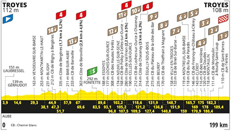 ![]() dimanche 7 juillet 2024 ![]() 13h35 (Aube) : D161 Troyes (km 0) - Dosches (km 8.1) - Géraudot (km 14.6) - D79 Vandeuvre-sur-Barse (km 29.3) - D12 Montmartin-le-Haut (km 38.1) - chemin blanc 14 de Bligny-en-Bordères (km 47.3 à 49.4) - D201 Côte de Bergère (km 51.7-GPM4) - chemin blanc 13 de Baroville (km 67 à 68.3) - D70 Côte de Baroville (km 69.6-GPM4) - Fontette (km 83.5-sprint) - chemin blanc 12 des Hautes-Forêts (km 96.8 à 98.9) - chemin blanc 11 de Polisy à Celles-sur-Ource (km 107.2 à 108.7) - Côte de Val Frion (km 107.5-GPM4) - chemin blanc 10 de Loches-sur-Ource à Chacenay (km 118.6 à 123) - Côte de Chacenay (km 121.2-GPM4) - chemin blanc 9 de Plateau de la côte des Bars (km 131.9 à 134.1) - chemin blanc 8 de Thiéffrain à Magnan (km 140.8 à 144.8) - chemin blanc 7 de Briel-sur-Barse (km 151.9 à 154) - chemin blanc 6 de Rue de Paradis (km 165.7 à 167) - chemin blanc 5 de Fresnoy-le-Château à Clérey (km 169 à 170.9) - chemin blanc 4 des Verrières (km 175 à 176.7) - chemin blanc 3 de Daudes (km 178 à 179.9) - chemin blanc 2 de Montaulin à Rouilly-Saint-Loup (km 182.3 à 184.5) - Ruvigny (km 185.3) - chemin blanc 1 de Saint-Parres-aux-Tertres (km 189.4 à 192.5) - Troyes / Bd. du 1er RAM (km 199). ![]() ![]() ![]() Vidéo Tour de France / DailyMotion ![]() Étape : ![]() 1. Anthony Turgis (Fra) en 4h19'43" (moy : 45.97 km/h) 2. Thomas Pidcock (Gbr) 3. Derek Gee (Can) 4. Alex Aranburu (Esp) 5. Ben Healy (Irl) à 2" 6. Alexey Lutsenko (Kaz) 7. Javier Romo (Esp) à 12" 8. Jasper Stuyven (Bel) à 18" 9. Biniam Girmay (Ery) à 1'17" 10. Michael Matthews (Aus) 11. Mathieu Van der Poel (Hol) 12. Rasmus Tiller (Nor) 13. Rui Costa (Por) 14. Jakob Fuglsang (Dan) 15. David Gaudu (Fra) 16. Pascal Ackermann (All) à 1'46" 17. Hugo Page (Can) 18. Mike Teunissen (Hol) 19. Gianni Vermeersch (Bel) 20. Luca Mezgec (Slo) 21. Jonas Abrahamsen (Nor) 22. Quentin Pacher (Fra) 23. Marijn Van den Berg (Hol) 24. Julio Ciccone (Ita 25. Aleksandr Vlasov (Rus) 26. Clément Champoussin (Fra) 27. Nelson Oliveira (Por) 28. Krists Neilands (Let) 29. Stefan Bisseger (Sui) 30. João Almeida (Por) 31. Cristian Rodriguez (Esp) 32. Carlos Rodriguez (Esp) 33. Pello Bilbao (Esp) 34. Santiago Buitrago (Col) 35. Juan Ayuso (Esp) 36. Matteo Jorgenson (Usa) 37. Primoz Roglic (Slo) 38. Jai Hindley (Aus) 39. Guillaume Martin (Fra) 40. Johannes Kulset (Nor) 41. Hugo Houle (Can) 42. Kevin Geniets (Lux) 43. Maxim Van Gils (Bel) 44. Tadej Pogacar (Slo) 45. Remco Evenepoel (Bel) 46. Adam Yates (Gbr) 47. Louis Vervaecke (Bel) 48. Jack Haig (Aus) 49. Jonas Vingegaard (Dan) 50. Michal Kwiatkowski (Pol) 51. Egan Bernal (Col) 52. Enric Mas (Esp) 53. Mikel Landa (Esp) 54. Wout Van Aert (Bel) 55. Oliver Naesen (Bel) 56. Felix Gall (Aut) 57. Warren Barguil (Fra) 58. Christophe Laporte (Fra) 59. Julien Bernard (Fra 60. Steff Cras (Bel) 61. Marc Soler (Esp) 62. Geraint Thomas (Gbr) 63. Laurens De Plus (Bel) 64. Davide Formolo (Ita) 65. Nico Denz (All) 66. Frank Van den Broek (Hol) 67. Toms Skujins (Let 68. Nils Politt (All) à 2'18" 69. Piet Allegaert (Bel) à 2'27" 70. Dorian Godon (Fra) à 2'38" 71. Thomas Gachignard (Fra) à 3'04" 72. Wilco Keldermann (Hol) à 6'10" 73. Tim Wellens (Bel) à 8'10" 74. Jake Stewart (Gbr) à 9'18" 75. Bryan Coquard (Fra) 76. Fred Wright (Gbr) 77. Alberto Bettiol (Ita) 78. Bob Jungels (Lux) 79. Pavel Sivakov (Fra) 80. Kobe Goossens (Bel) à 11'42" 81. Louis Meintjes (Afs) 82. Jan Tratnik (Slo) 83. Silvan Dillier (Sui) 84. Clément Russo (Fra) 85. Valentin Madouas (Fra) 86. Tiesj Benoot (Bel) 87. Tim Declercq (Bel 88. Yves Lampaert (Bel) 89. Romain Grégoire (Fra) 90. Bart Lemmen (Hol) 91. Kévin Vauquelin (Fra) 92. Soren Wærenskjold (Nor) 93. Jonathan Castroviejo (Esp) 94. Cedric Beullens (Bel) 95. Stefan Küng (Sui) 96. Ben Turner (Gbr) 97. Ryan Gibbons (Afs 98. Odd Christian Eiking (Nor) 99. Luca Mozzato (Ita) 100. Matteo Sobrero (Ita) 101. Ilan Van Wilder (Bel) 102. John Degenkolb (All) 103. Nans Peters (Fra) 104. Romain Bardet (Fra) 105. Carlos Verona (Esp 106. Victor Campenaerts (Bel) 107. Brent Van Moer (Bel) 108. Jasper Philipsen (Bel) 109. Georg Zimmermann (All) 110. Laurenz Rex (Bel) 111. Axel Zingle (Fra) 112. Nicolas Prodhomme (Fra) 113. Bruno Armirail (Fra) 114. Richard Carapaz (Equ) 115. Mathieu Burgaudeau (Fra) 116. Jordan Jegat (Fra) 117. Fabien Grellier (Fra) 118. Paul Lapeira (Fra) 119. Sébastien Grignard (Fra) 120. Arnaud Démare (Fra) 121. Daniel McLay (Gbr) 122. Marco Haller (Aut) 123. Guillaume Boivin (Can) 124. Mark Cavendish (Gbr) 125. Michael Morkov (Dan) 126. Yevgeniy Fedorov (Kaz) 127. Jesus Herrada (Esp) 128. Christopher Juul-Jensen (Dan) 129. Soren Kragh Andersen (Dan) 130. Axel Laurance (Fra) 131. Wout Poels (Hol) 132. Oscar Onley (Gbr) 133. Chris Harper (Aus) 134. Stephen Williams (Gbr) 135. Magnus Cort Nielsen (Dan) 136. Cees Bol (Hol) 137. Simon Geschke (All) 138. Simon Yates (Gbr) 139. Harold Tejada (Col) 140. Jan Hirt (Tch) 141. Fernando Gaviria (Col) 142. Oier Lazcano (Esp) 143. Neilson Powless (Usa) 144. Arnaud De Lie (Bel) 145. Gregor Mühlberger (Aut) 146. Mattéo Vercher (Fra) à 12'01" 147. Gianni Moscon (Ita) 148. Lenny Martinez (Fra) 149. Sandy Dujardin (Fra) à 14'19" 150. Sean Quinn (Usa) à 15'03" 151. Luke Durbridge (Aus) à 15'35" 152. Alexis Renard (Fra) à 18'05" 153. Amaury Capiot (Bel) 154. Nikias Arndt (All) 155. Danny Van Poppel (Hol) 156. Matej Mohoric (Slo) 157. Phil Bauhaus (All) 158. Harm Vanhoucke (Bel) 159. Elmar Reinders (Hol) 160. Dylan Groenewegen (Hol) 161. Robbe Ghys (Bel) 162. Alexander Kristoff (Nor) 163. Ion Izagirre (Esp) 164. Jonas Rickaert (Bel) 165. Sam Bennett (Irl) 166. Raul Garcia Pierna (Esp) 167. Tobias Halland Johannessen (Nor) 168. Davide Ballerini (Ita) 169. Jarrad Drizners (Aus) 170. Nils Eekhoff (Hol) à 27'24" 171. Bram Welten (Hol) 172. Fabio Jakobsen (Hol) 173. Gerben Thijssen (Bel) Prix de la combativité : Jasper Stuyven (Bel) Classement général : ![]() 1. Tadej Pogacar (Slo) en 35h42'42"